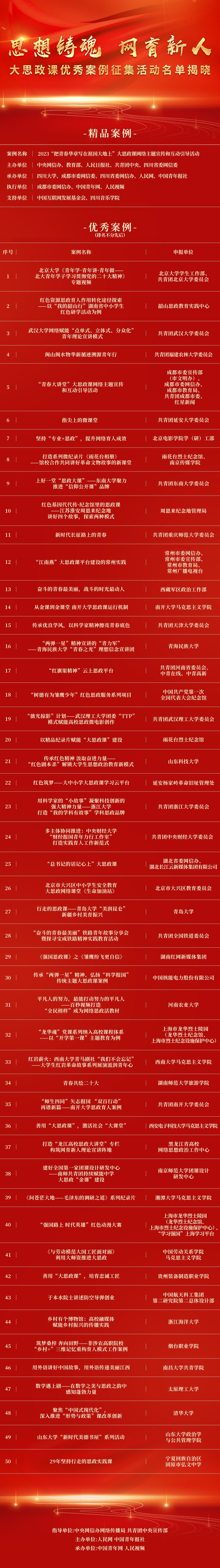 好博体育北京2月10日电 (记者王鑫)由中央网信办网络传播局、共青团中央宣传部指导,好博体育、中国青年报社共同主办的“思想铸魂 网育新人”大思政课优秀案例征集活动评选今天揭晓结果,经初选、终选以及结果公示,产生精品案例1件、优秀案例50件,名单如下: