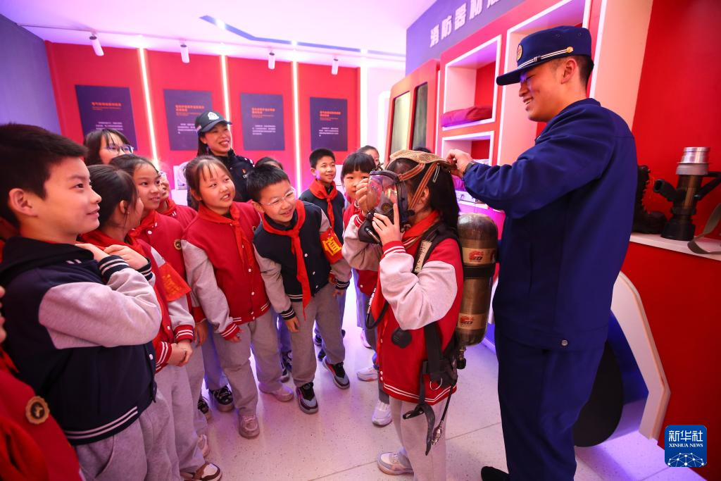 3月31日,消防员在山东省济南市市中区消防科普教育基地帮助小学生体验消防装备。