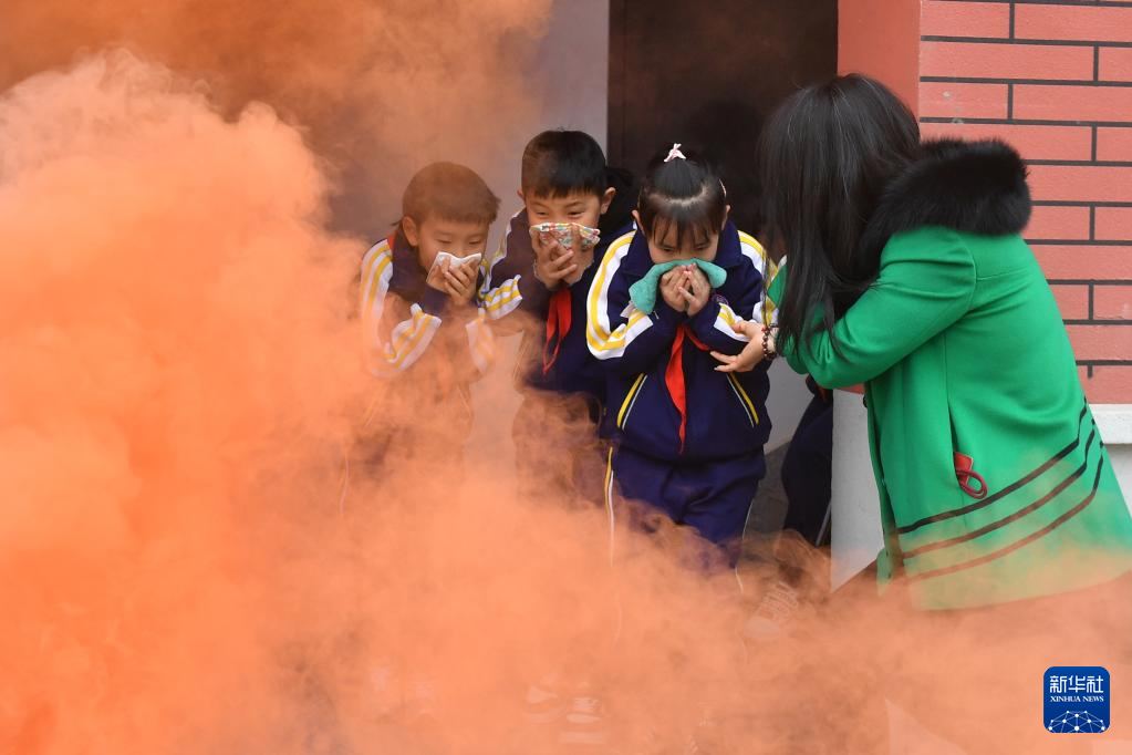 3月31日,在山东省青岛市市北区杭州路小学开展的校园消防安全主题教育活动上,师生模拟校园安全门逃生演练。