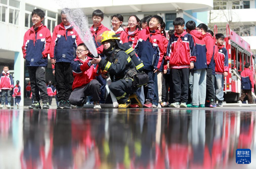 3月31日,在江苏省扬州市邗江区美琪学校,学生在消防员指导下体验使用消防水枪。