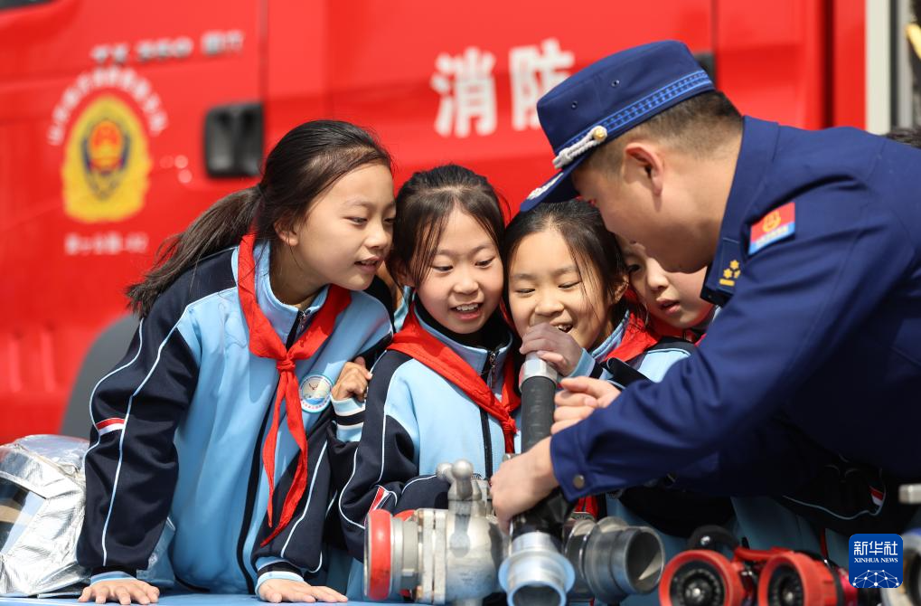 3月31日,在山东省临沂市郯城县第三实验小学,消防救援人员为学生讲解消防装备器材。