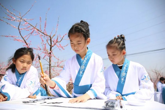4月10日,北京市平谷区第二十七届国际桃花节在大华山镇桃源逸栈盛大开幕,千名中小学生共书“新桃花源”。开幕式现场,来自平谷区18所中小学的1000名学生齐聚一堂,以百米长卷为载体,挥毫书写《新桃花源记》,将乡土情怀融入笔墨之间。
