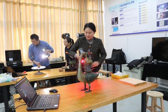 文物数字研究中心成员运用三维扫描技术对文物展开数字扫描