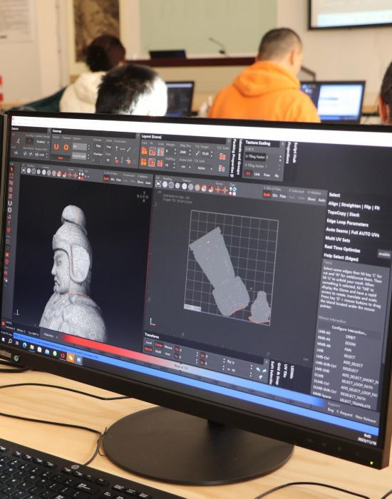 走进文物数字研究中心实验室,三维扫描仪、全景相机、全息展台等设备陈列一新。“这些不仅是教学工具,更是实战武器。”专业教师周权虎为文物与博物馆学专业学生开授的“数字雕刻”课程,注重理论与实践结合,是“文物+数字”课程共建体系下的教学创新。学生们通过学习掌握传统技艺、艺术审美内容的数字化表达能力,创作产出了许多优秀的数字作品。
